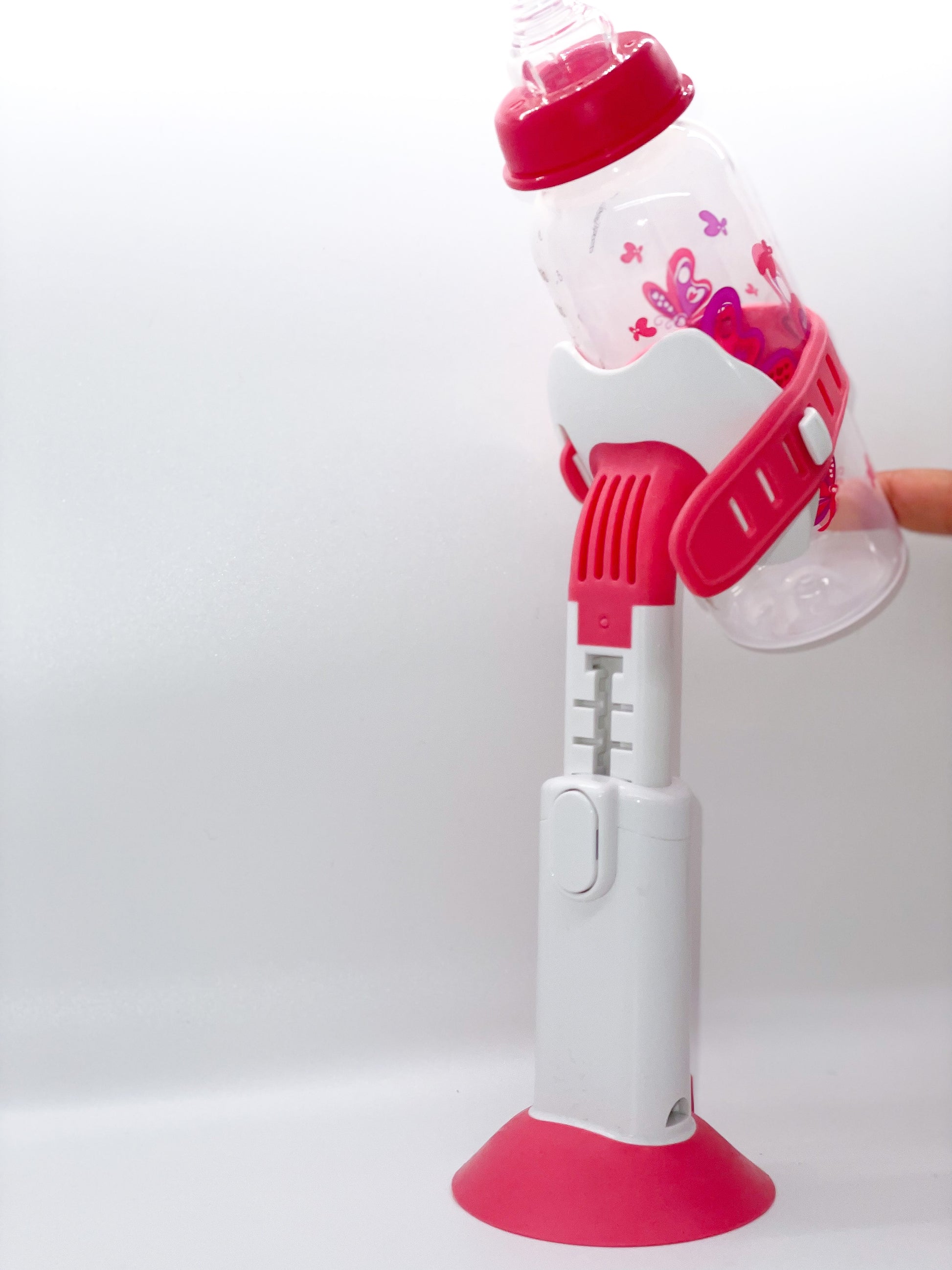 The Babaste Bottle Holder is specially designed with a strap securely holding most bottles. This ensures parents that their baby is fed without the constant disruption of bottles being dropped or thrown!